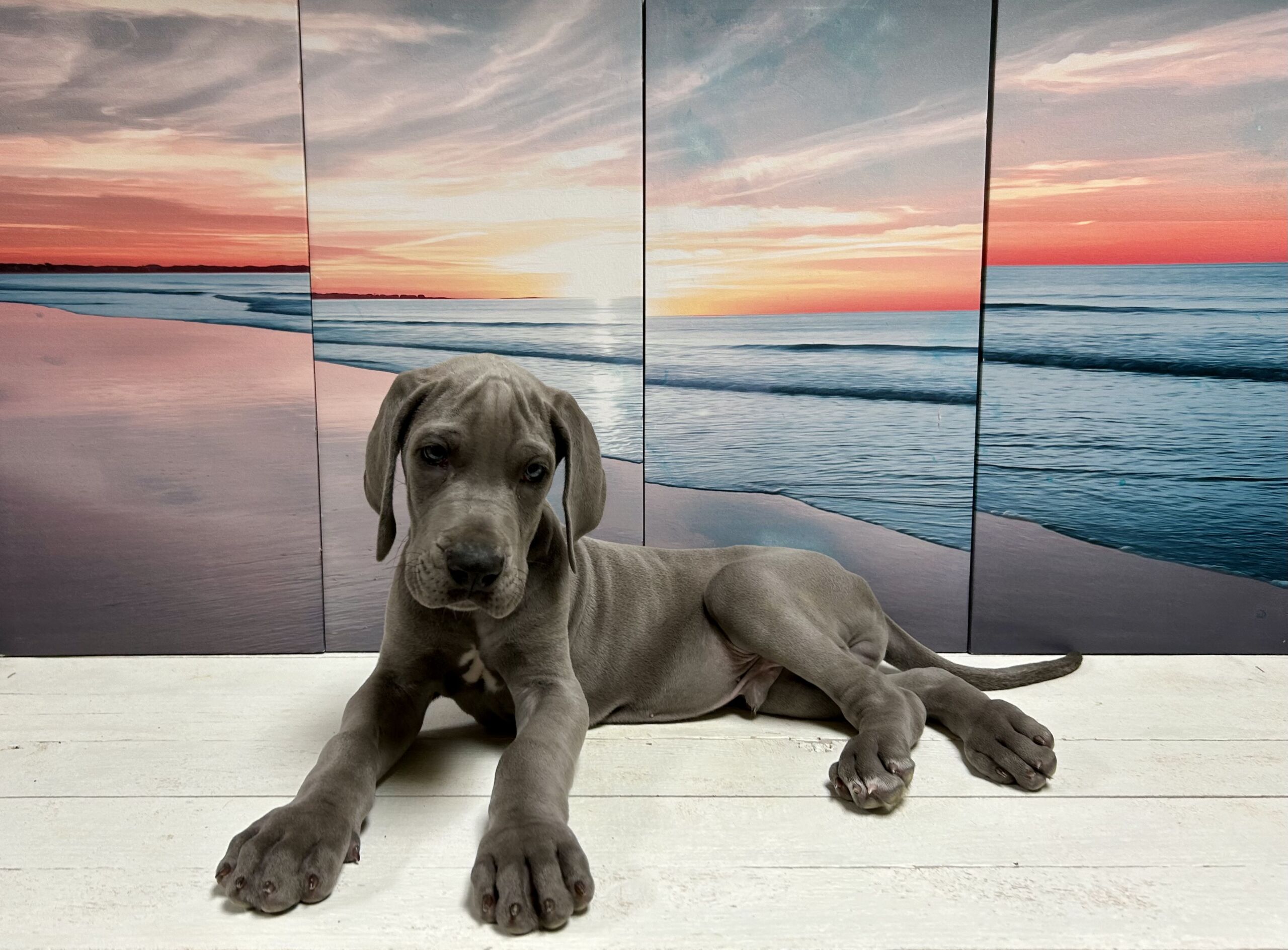 A big breed with an even bigger heart, the Great Dane is a large and lovable dog that brings happiness and unconditional love to its human friends. These gentle giants have a calm and sweet temperament, and get along well with other dogs, pets, and humans. They are eager to please, and love to be loved! In adulthood the Dane can range from 100 to 200 pounds and is seen in the beautiful coat colors of harlequin, mantle, blue merle, and fawn. Great Danes do require quite a bit of space, so homes with a yard may be best for your new friend.