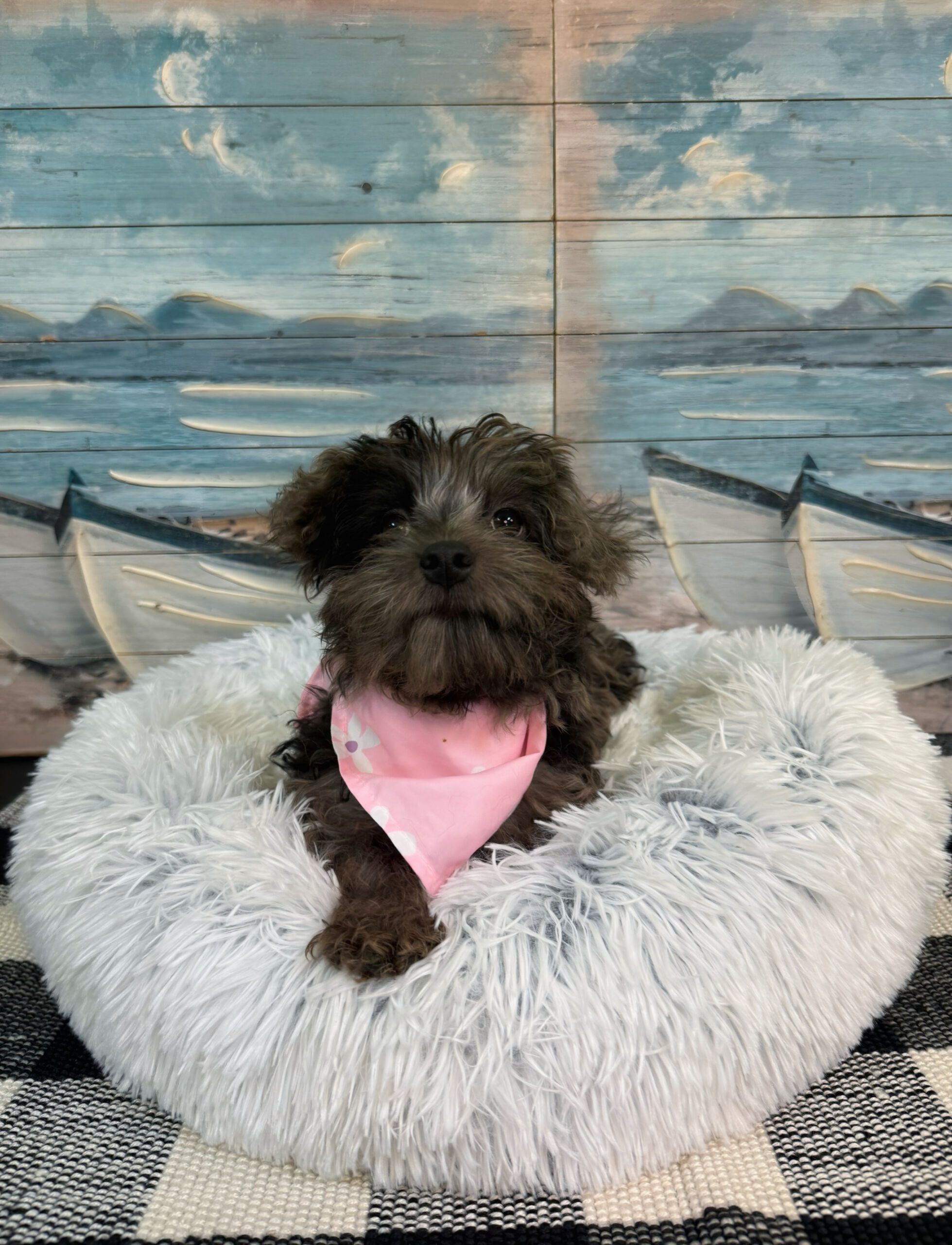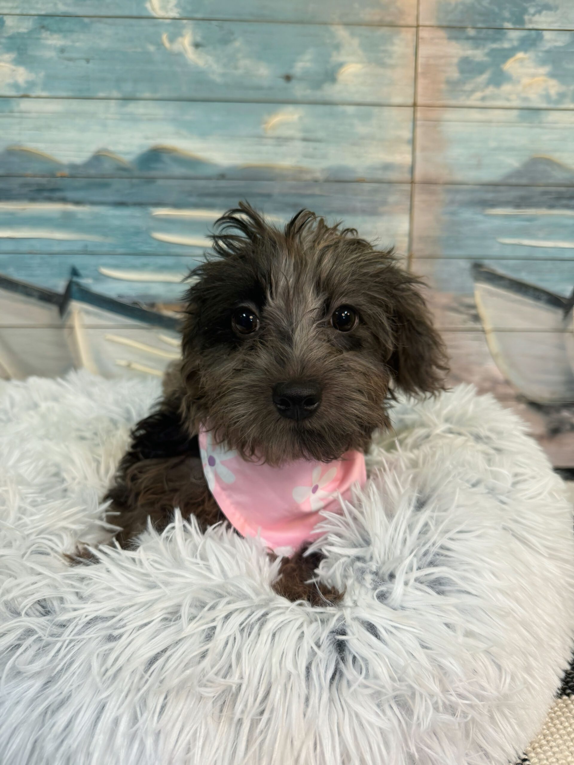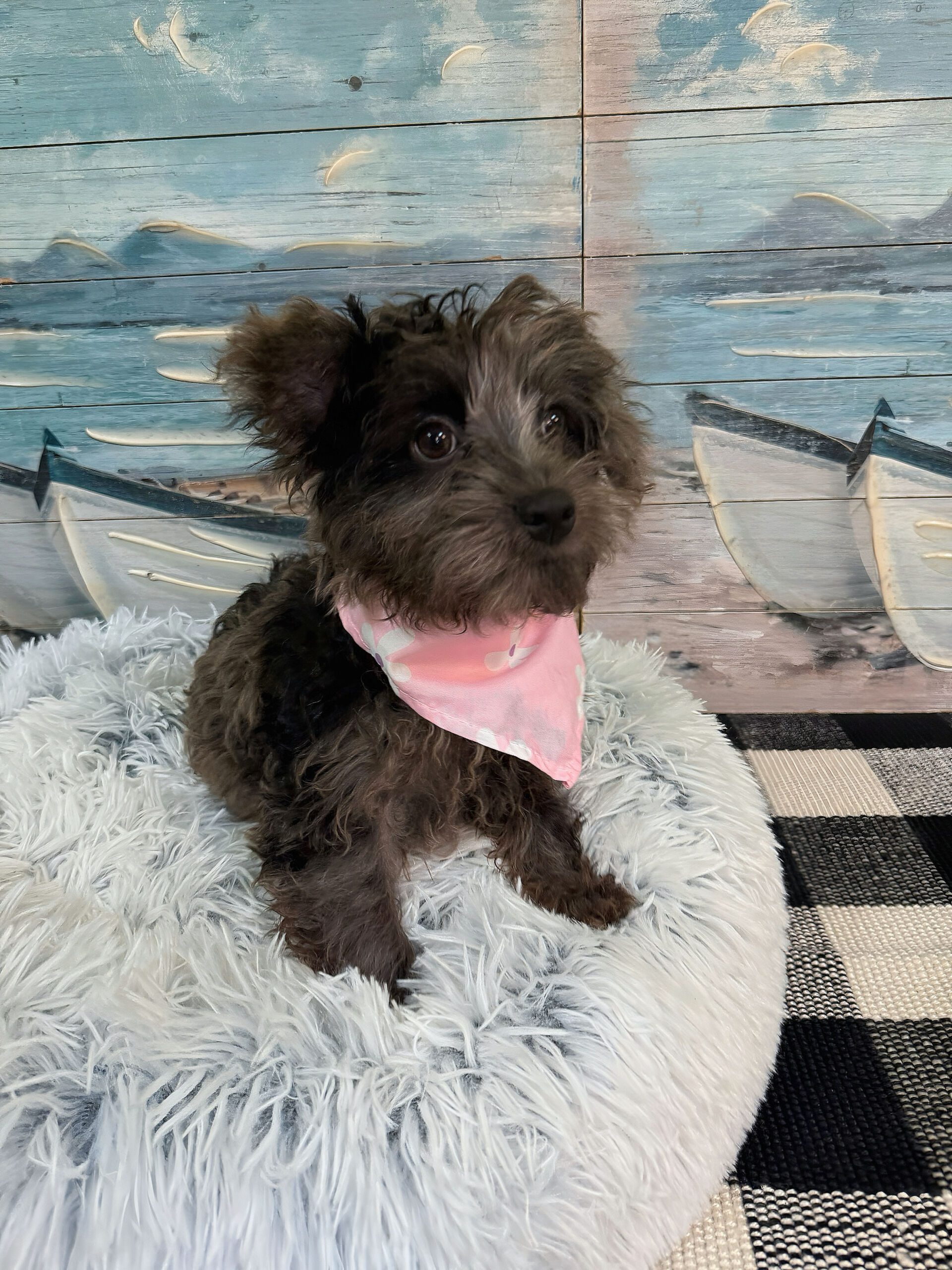 This adorable small breed pup is lively and fun. The Yorkie Poo is a light hearted and friendly designer breed typically bred by crossing a Yorkshire Terrier and a Mini Poodle. This gives us a general size range of 6 – 14 pounds. Yorkie Poos as puppies are seen in jet black, black and tan, and sometimes seen in apricot or chocolate. As adults they commonly undergo a bit of a color change to reflect more of the Yorkshire’s adult look and less of the Poodle. The Yorkie Poo normally gets along great with kids and other pets and makes a great family friend.